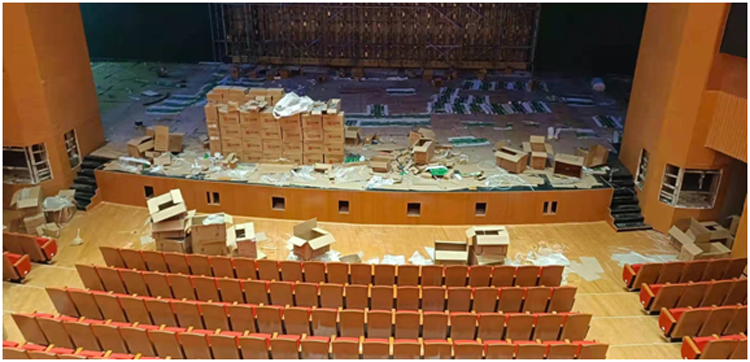 4、实木舞台地板整体颜色一般都以黑色、红色为主(下图是我司2021年度河南确山文化职工中心的完工效果图)
