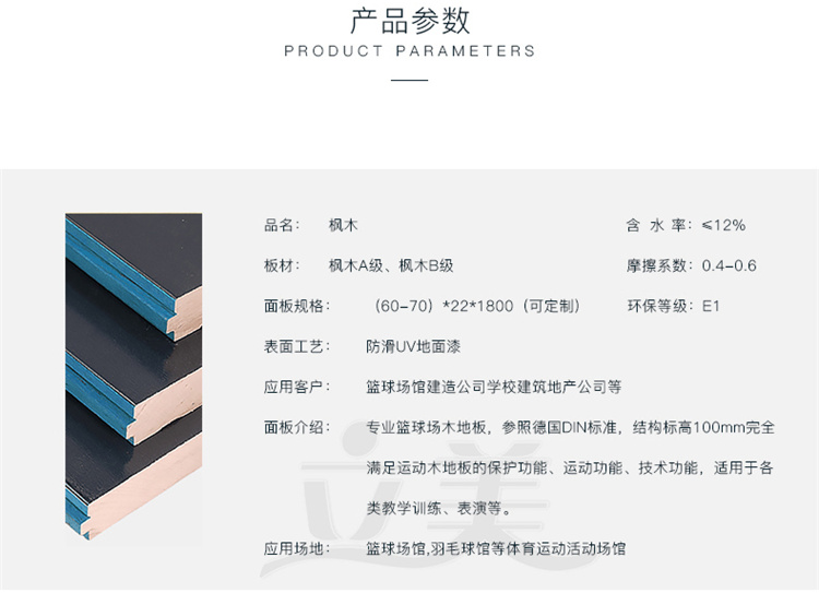 专业篮球场木地板,参照德国DIN标准,结构标高100mm完全满足运动木地板的保护功能、运动功能、技术功能,适用于各类教学训练、表演等。 |
