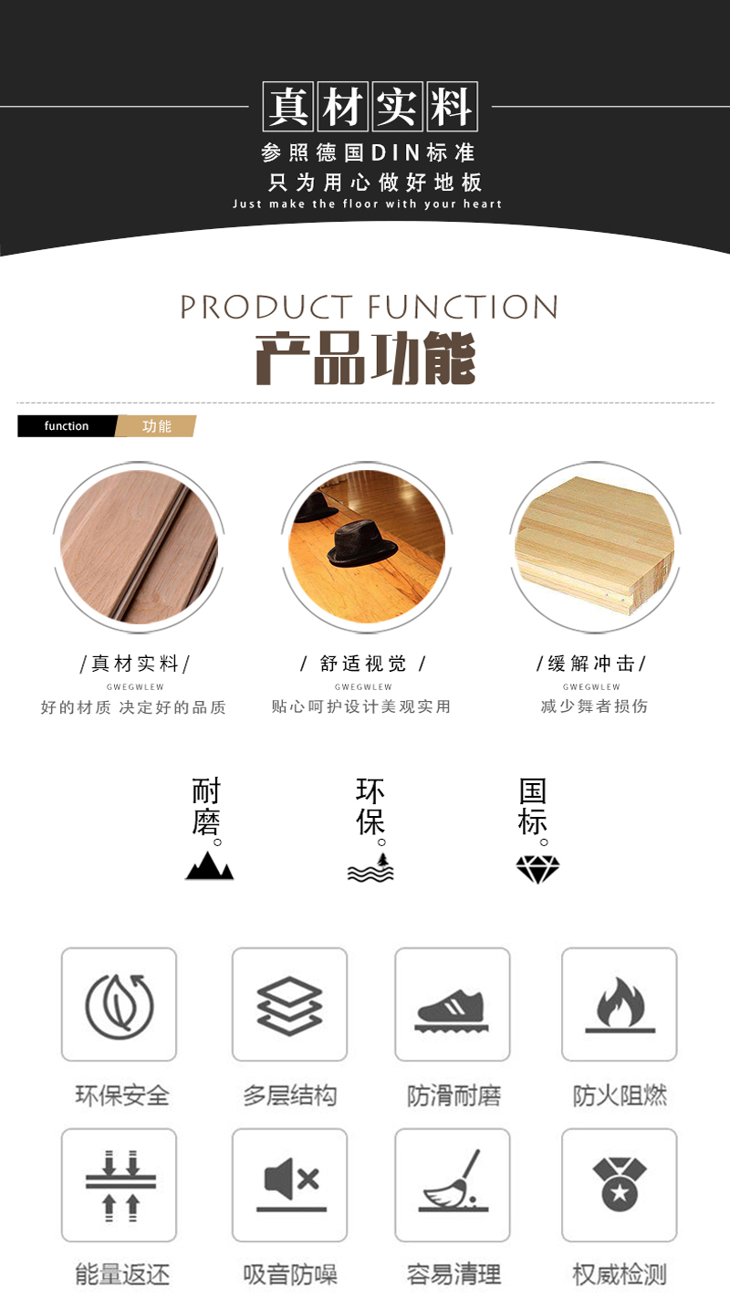 2、舞者在表演过程中,舞台木地板太滑或者是太涩,都会严重影响舞蹈演员真实的发挥水平,所以舞台运动木地板的摩擦系数必须为0.4—0.7,即国际标准。严格的摩擦系数更保证了舞者的使用安全性。