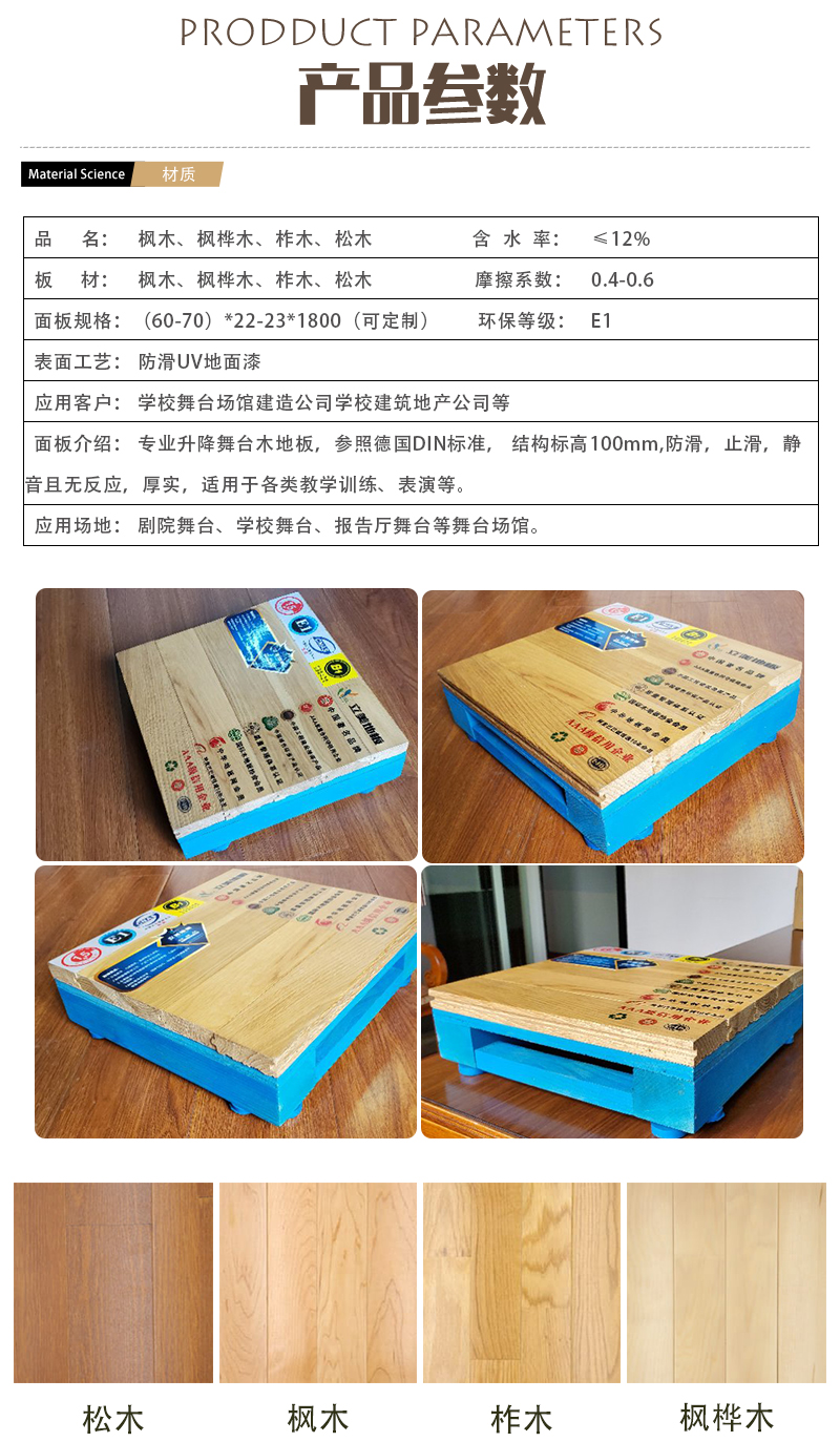 3、舞台运动木地板在使用中,大多使用较硬的纯木质树种型材,来对其进行加工制作。比如枫木或柞木作为舞台运动木地板的原材料,经加工后这样的树种其材质整体木纤维相对较长,从而造就舞台运动木地板在使用过程中具有很强的硬度,终舞台木地板的表面承重力、坚固性、耐磨性会非常好。