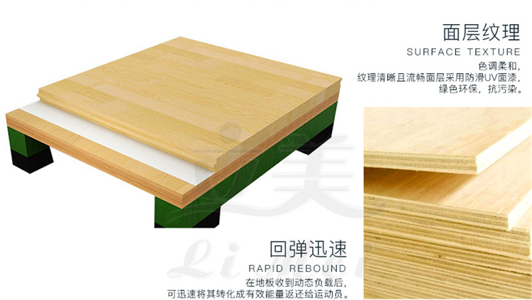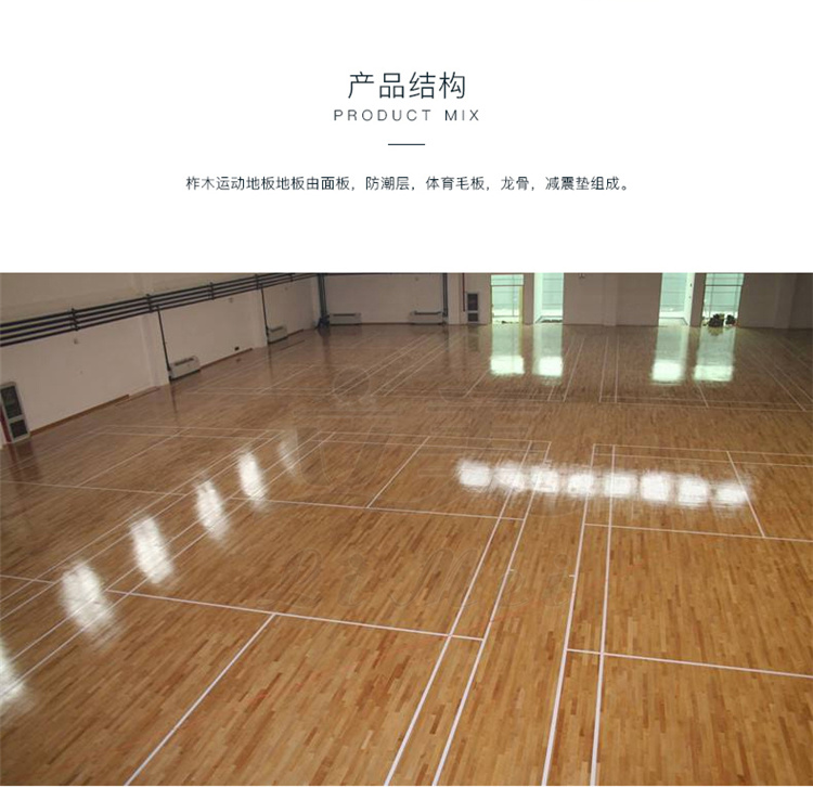 专业篮球场木地板,参照德国DIN标准,结构标高100mm完全满足运动木地板的保护功能、运动功能、技术功能,适用于各类教学训练、表演等。 |
